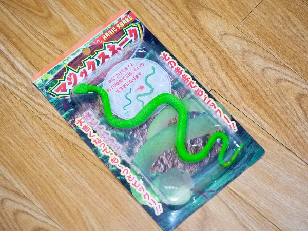 へびのおもちゃです。なんと70時間水につけておくと2倍のサイズになるらしい。